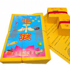內容物:皈依三寶金、金剛神咒、六道輪迴金、往生錢、四方金、銀紙、喵喵幣、汪汪幣、祈福疏文